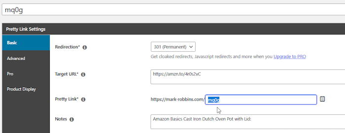 The difference is this short link features my domain name. What I like best about using Pretty Links is no matter how many times I use Pretty Link on my web site. Rather than having to go to each post and replace the affiliate link, I can go into my Pretty Link and edit the affiliate link there, and it fixes it all over my website. I won’t know about you, but this is a huge time-saver and convenience for me.
