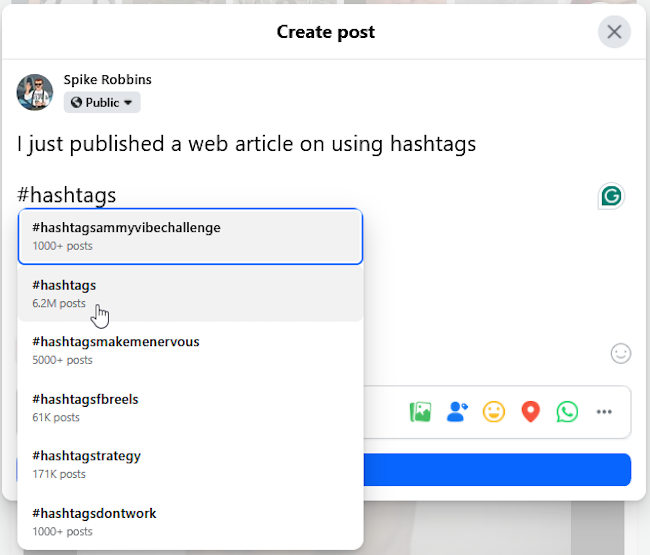 So finding the right hashtag is pretty easy. But before we get too deep into this, let’s talk numbers. When you star to type in your hashtag. Facebook for example will display several variations of our hashtag word. In my example image below, I typed in #hashtags, and as you can see it generated 6 variations. Pay attention to the numbers below each term. #hashtags has 6.2M (thats million) posts, #hashtagstrategy has 171K (that’s 171,000) posts.