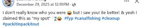 A hashtag is a word or phrase with a # symbol in front of it. In the image below, here is a example of a facebook post a local angler made about littering. She added 4 #hashtags (hi-lighted in blue) related to both fishing and cleaning up after yourself.